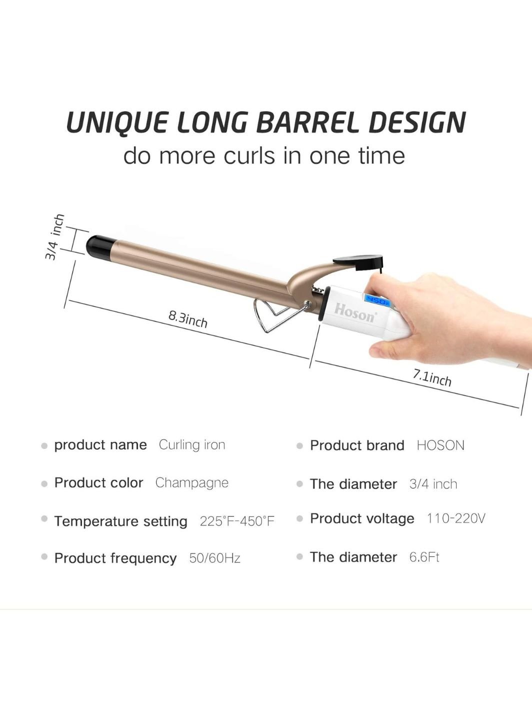 The Hoson 19mm Ceramic Curling Tongs for Long Hair are designed to deliver smooth, defined curls with professional ease. The long barrel allows even long hair to wrap comfortably, creating consistent curls from root to tip. With dual voltage and nine adjustable heat settings ranging from 110°C to 210°C, it suits every hair type—fine, thick, straight, or wavy.