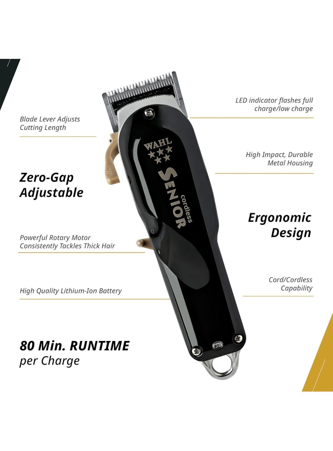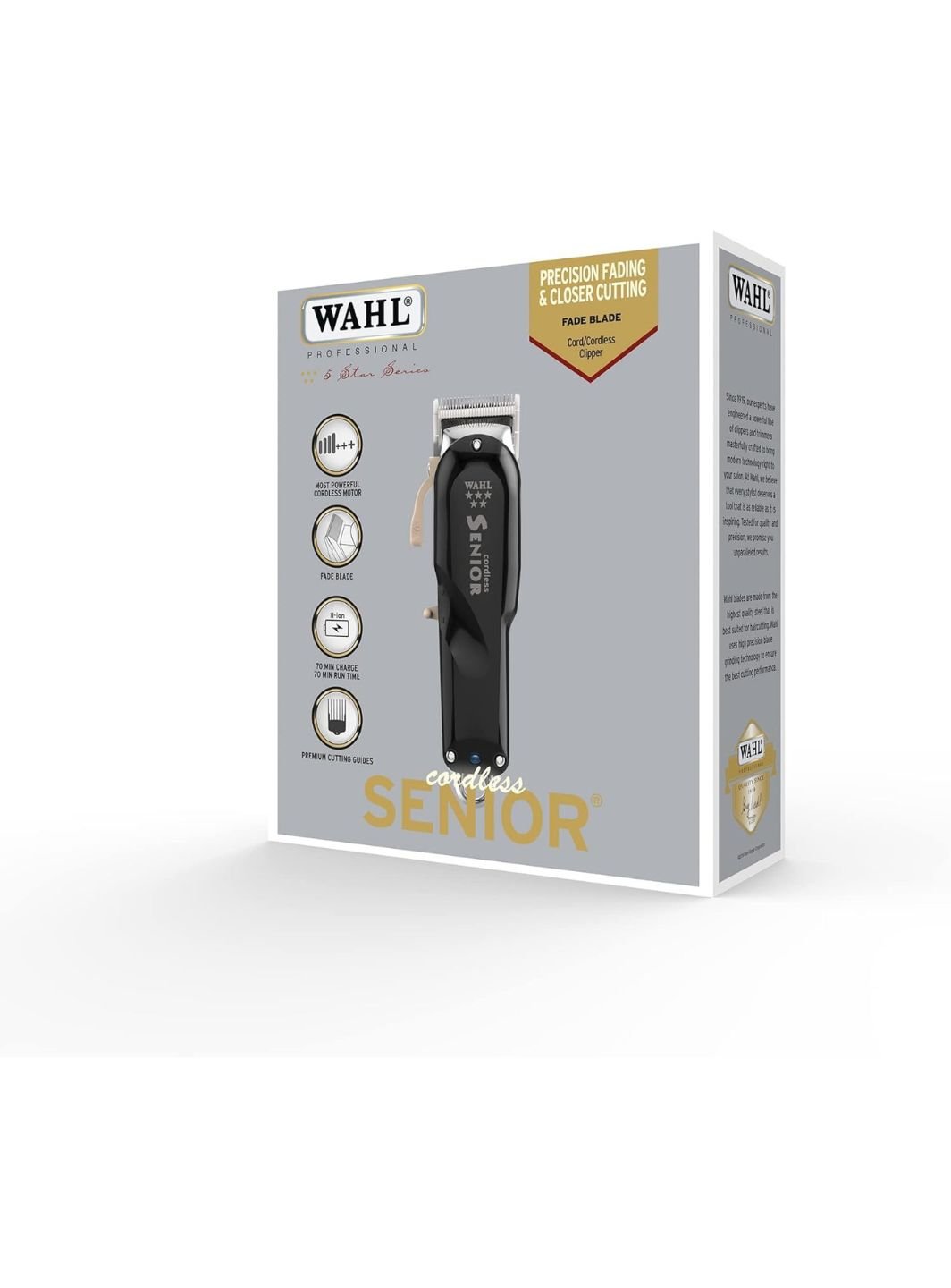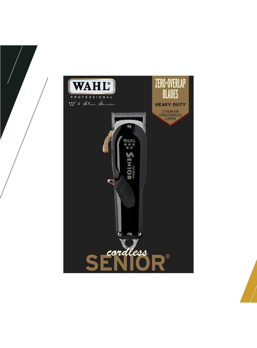 The Wahl 5 Star Cordless Senior Clipper packs a powerful rotary motor (up to ~6,500 rpm) into a lightweight cordless body. Its chrome fade blade, paired with a thumb taper lever, lets barbers achieve ultra-close cuts — from 0.8 mm up to 2.5 mm — making it perfect for smooth fades and crisp details.
